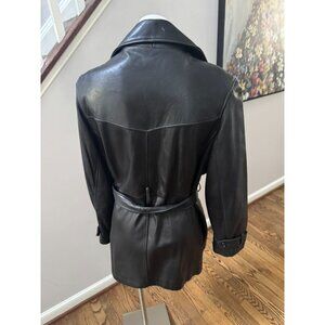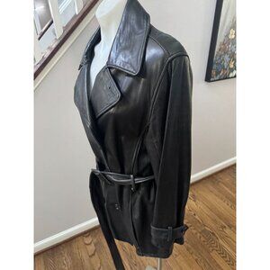 Andrew Marc Additions Black Leather Belted Double Breasted Trench Coat Jacket Size Medium