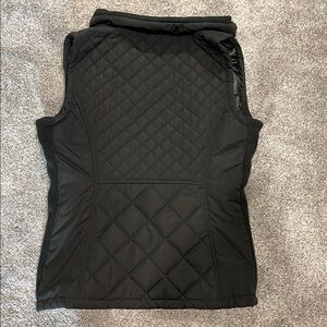 Stylish black vest with quilted texture. Features zipper accents. Perfect for layering.