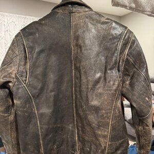 Jacket is in excellent condition. The distress markings have been done intentionally by the manufacturer. There are no tears, scuffs or stains. The jacket appears to have barely been worn. The inside quilted lining is clean and in excellent condition too.