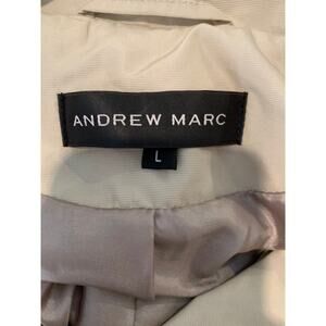 Andrew Marc unique tan double breasted belted trench coat, size L. Great detailing like silvery black hardware, chunky zipper detail on sleeves & pockets & buckle detail at collar give this trench an edgy moto vibe. Fully lined, kick pleat and & extra buttons included. 100% polyester