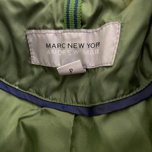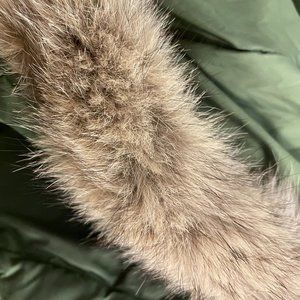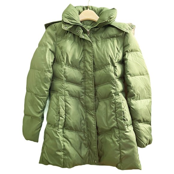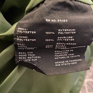 Real down insulation!! Real fur hood!! Stylish green puffer jacket by Andrew Marc. Features a high collar and beautiful real fur hood!! Features quilted design. Perfect for cold weather. Same measurements in photos. I'm adore this code. It's just getting a little snug on me. This coat has gotten a two tiny holes in the back. And the hood has been sewn on since the hood zipper broke