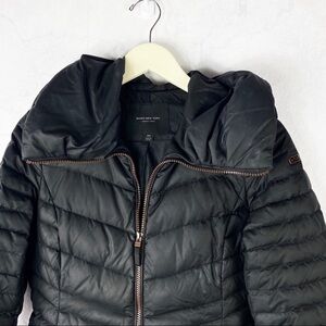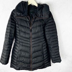 Marc New York Women's Outwear. Puffer Kirby Short Chevron Quilted Down Coat Jacket. Dark Black Color. Oversized Fold Over Collar. Side Hand Pockets. Straight Hemline. Full Zipper Closure. Lined. Cute & Comfy. Great Condition. No Stains or Rips.