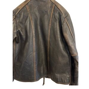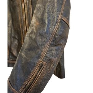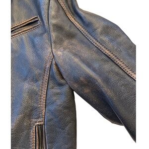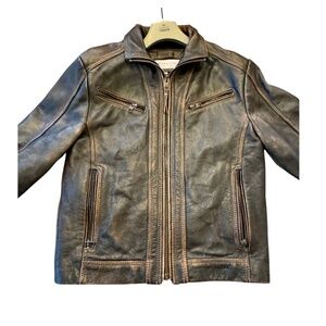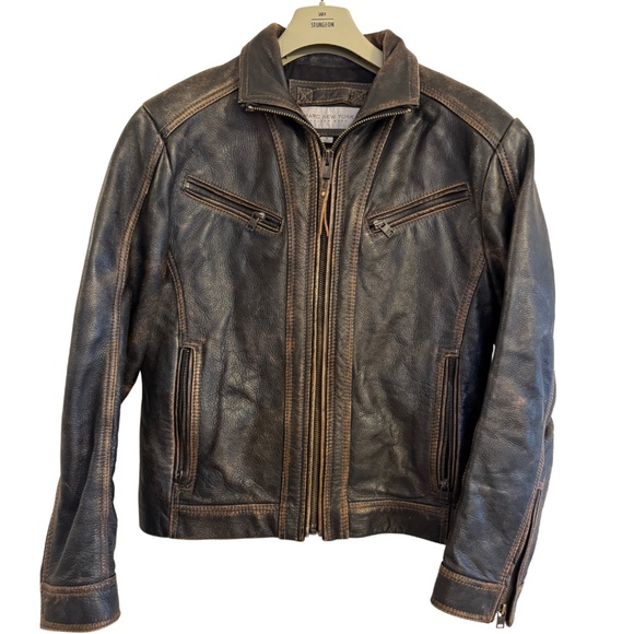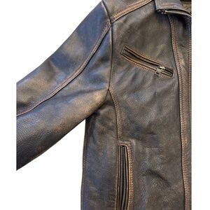 Rich dark brown leather with a naturally distressed finish, zip-front design, and tailored fit.