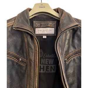 Classic, rugged, well-made leather jacket from Andrew Marc New York featuring a bomber-inspired, moto-leaning design. Crafted from genuine leather with a naturally broken-in look, this jacket has substantial weight and a rich, distressed patina that adds character.