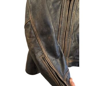 • Leather shows natural creasing, tonal variation, and light distressing consistent with the jacket’s original design and normal wear