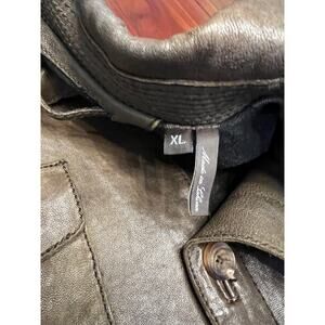 Stylish and rugged Andrew Marc men’s leather jacket in size XL. This jacket is made of genuine leather with a distressed brown finish for a classic vintage look. Features include: Two button-flap chest pockets. Shoulder epaulets. Button cuffs. Full button-front closure. Tailored seams for a sharp fit. Size tag: XL. Condition: Excellent pre-owned, shows normal light wear consistent with leather but no major flaws. From a nonsmoking home. A versatile piece that works equally well for casual wear or dressing up with jeans and boots.