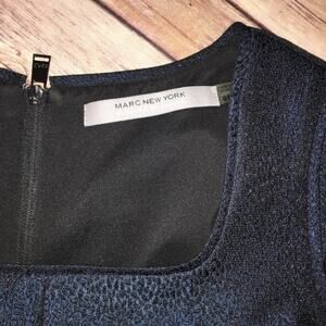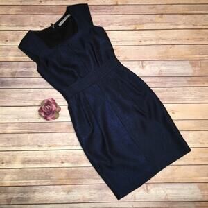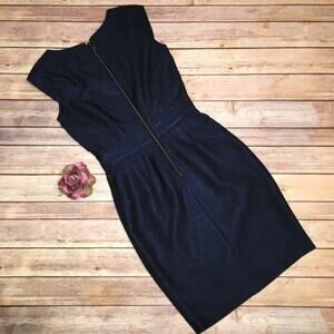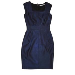Features: Blue and Black metallic fabric. Flattering sheath design. Exposed back zipper. Fully lined.