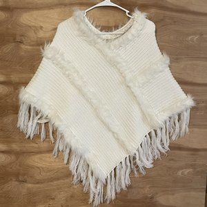 Andrew Marc New York Poncho Sweater One Size White Faux Fur Trim V Neck Fringe.