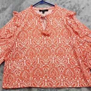 Andrew Marc New York Top Womens L Orange Linen Blend Ruffle Trim Damask Stamp Print
