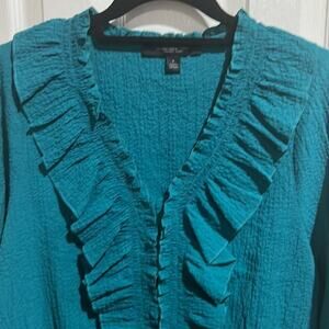 Andrew Marc New York Turquoise Ruffle Neck Top long Sleeve Sz S
