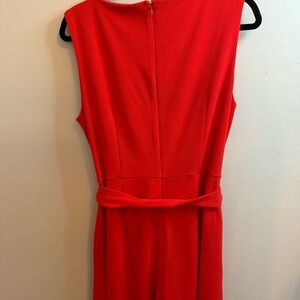This elegant orange jumpsuit by Andrew Marc is designed for wedding guests and cocktail occasions. It features a sophisticated V-neckline and a sleeveless style, with a chic wide leg silhouette that adds a touch of modern flair.