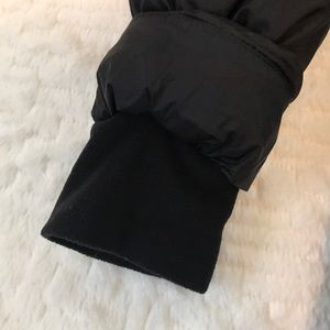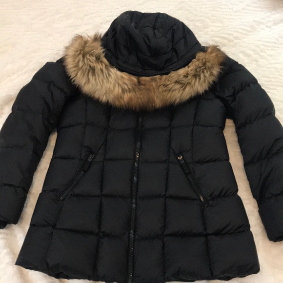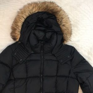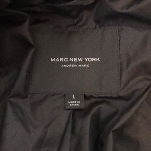 Size Large Andrew Marc Puffer Jacket with removable hood. Fleece lined zipper pockets and inner zip pocket at chest. The shell is nylon and the lining is polyester. The fill is down waterfowl feathers. Great condition- wore once and decided I needed a different size.