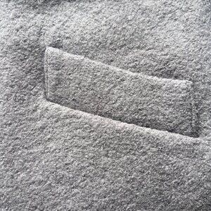 This Andrew Marx Regime coat offers a sophisticated look, featuring a tailored fit, soft wool-blend fabric, and a button-up closure. Its knee-length design and subtle gray tone make it a versatile addition to a professional wardrobe.