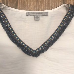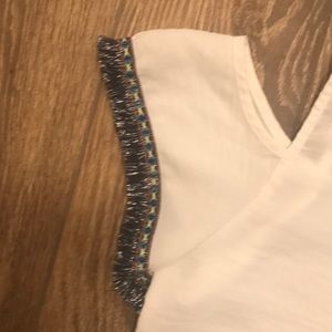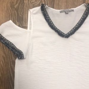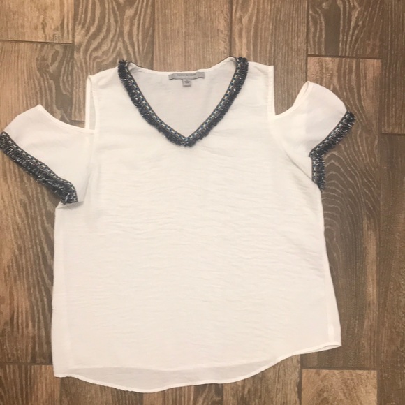 Fun, off the shoulder top with cute stitched design around the neck line and sleeves along with blue and silver frills. Fabric is slightly sheer and a nice vibrant white. Top is like new.