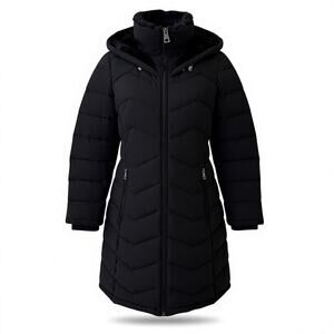 Andrew Marc Women Black Zipper Front Faux Fur Hoodie Puffer Coat Size M - NWT. New with tag puffer coat. Side zipper pockets, hidden inside zipper pocket, logo on arm. Stay warm and stylish with this Andrew Marc walker coat! This black coat features a zipper front and a cozy faux fur hoodie, perfect for chilly days.