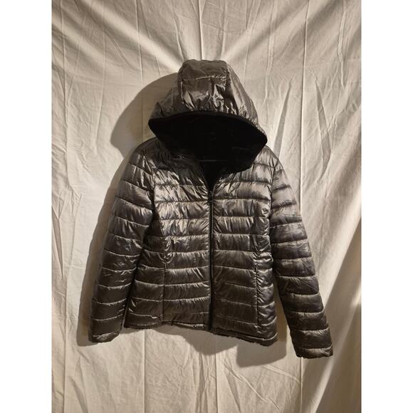 The Andrew Marc Women's Jacket Coat is a stylish and warm outerwear option perfect for the winter season. Made of polyester with a silver color and fur trim accents, this size M jacket features a hood for added protection against the cold. The down insulation ensures maximum warmth, making it a practical and fashionable choice for any woman looking to stay cozy and on-trend during the colder months.