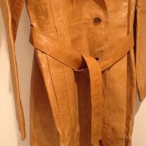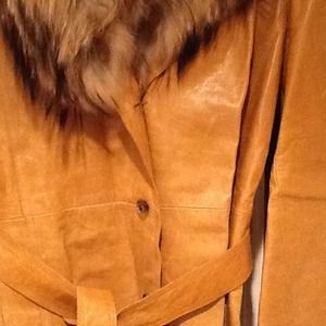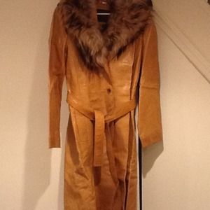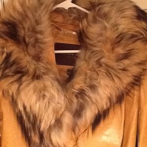 Stunning Andrew Marc knee length camel distressed leather belted coat w removable real fur collar. This is a statement coat magnificent!