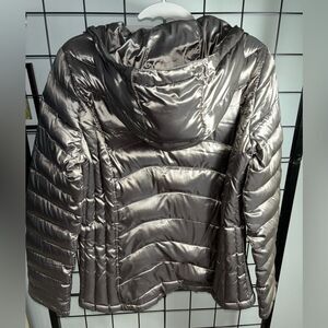 Andrew Marc lightweight puffer jacket. Beautiful metallic gray with a cream colored inside. Has pockets on the inside. Zippered pockets on the outside. Adjustable hood to keep warmth in. Has its own matching travel bag to put jacket away. Feather filled. Measures about 20” p2p and 23.5” shoulder to hem. Excellent used condition.