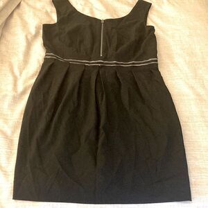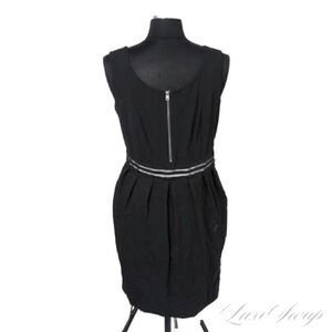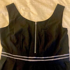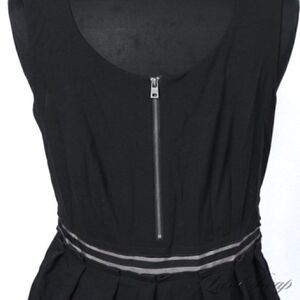 Andrew Marc NY black dress with exposed zipper on bodice, gray/black inset around waist,scoop neckline, sleeveless and fully lined.