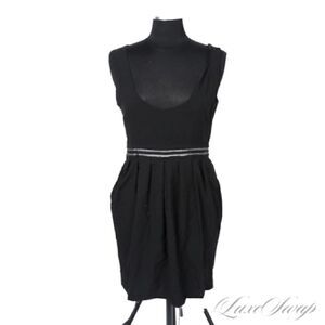 Andrew Marc NY Black Dress with Zip Front and Gray/Black Ribbon Inset at Waist.
