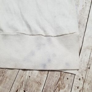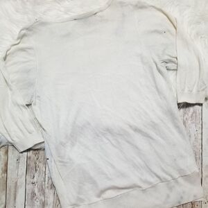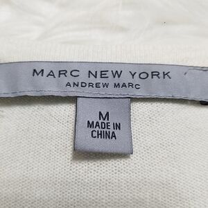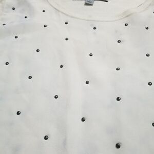 Marc New York andrew marc grey studded white blouse, size M, 1/2 sleeve, white elastic band around hem and cuffs of blouse, 65% cotton 35% viscose/front: 100% polyester, slight stain on back lower right side (see pic), good condition.