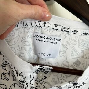 Androgynous Fox Non Binary Graphic Printed Tee Button Neck Black White Medium