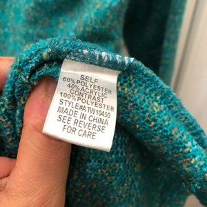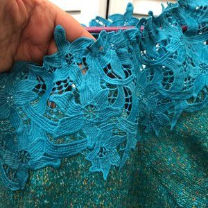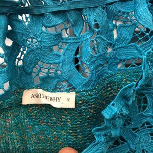 AndtheWhy lace Cactus off the shoulder sweater, teal/turquoise off the shoulder sweater with floral embroidered neckline. Lightweight and very pretty. Neckline has elastic so it won't slip down. Size medium