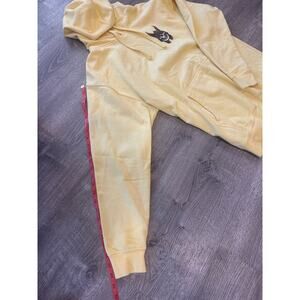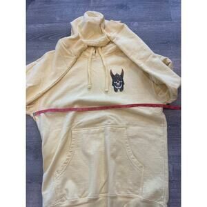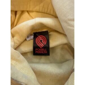 The Andy Anderson Sweater is a men's large Powell Peralta skateboard hoodie featuring a graphic print with a skull heron design. This yellow hoodie is made of a comfortable cotton blend fleece material, perfect for cold seasons like winter, fall, and spring. It includes a drawstring closure, hood, and pockets for added functionality. Ideal for outdoor activities such as skateboarding, running, or walking, this pullover hoodie also has a classic beach style with a touch of sports theme, making it a versatile and stylish choice for men looking for a unique and comfortable addition to their wardrobe.