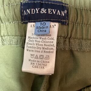 The product is a pair of Andy & Evan Kid's Boys Pant in Green- Chino Jogger style, size 10. Made of 100% cotton, these pants feature an elastic waist for a comfortable fit. They also have pockets for added functionality. Perfect for young boys who love to stay stylish and comfortable.