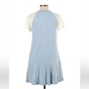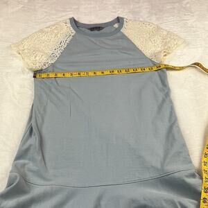 Soft teeshirt dress with lace short sleeves and a drop waist. Nice amount of stretch, no pockets. Light mark on skirt, see last pic.