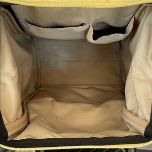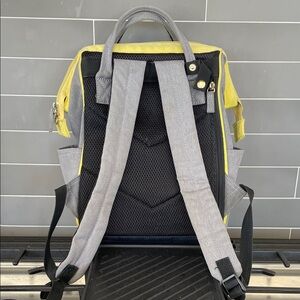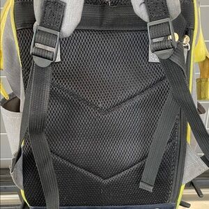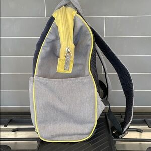 Stylish and versatile men's backpack in navy, gray, and yellow. Perfect for daily use with ample storage space. Used but has a lot of life left. See marks and staining on yellow trim from wear. Zipper pull is missing (see photo) but zipper is still functional