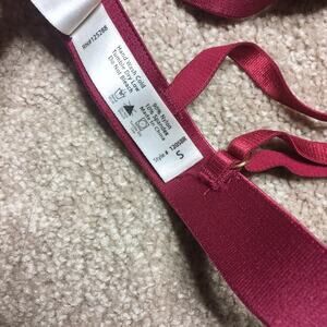 Size small dark red lace strappy bralette. Center straps, top of cup area cut out. Double hook closure.