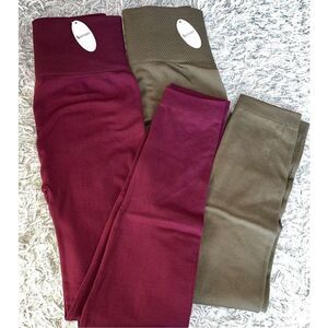 Brand new with tags from a smoke free home. Set includes two pair of leggings in burgundy and olive green. These leggings are one size fits most from small to medium. Super soft, very stretchy and stylish fleece legging, high-waist sleek tummy control legging, inside is very soft and cozy fleece that keeps you warm and comfy. It is the perfect amount of stretch and tummy control. This legging is designed to add warmth and style without bulkiness, great with tunics, long sweaters, etc. 65% Polyester, 20% Cotton, 15% Spandex