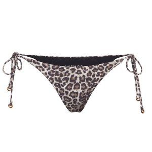 Sleek and simple. A retro, 70's sensibility to today’s coastlines. Designed with a feminine gathered bodice and bold leopard print, this style is the epitome of chic. The String Tie Bikini Bottom is designed to be worn high or low on the waist. Petite tortoise rings finish the string detailing with a hint of polish. Ships with Anemos wash bag.