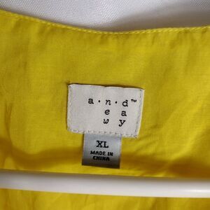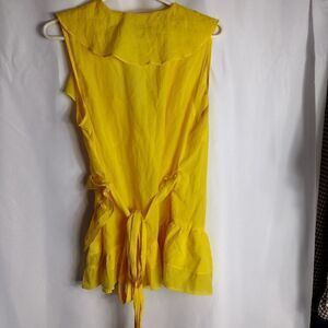 lightweight, yellow, cross front top with ties. there is a small discoloration on the left side, see picture. Ruffled collar. pit to pit 21" length 26"
