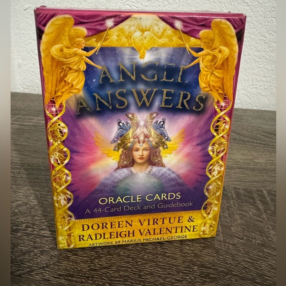 Angel Answers Oracle Cards with guidebook. Features vibrant purple and gold design.