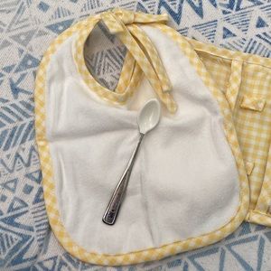 Adorable travel set for baby with spoon, matching white and yellow terry cloth bib and wash cloth. All contained in a carrying case with embroidered abcโs. New without tag.