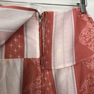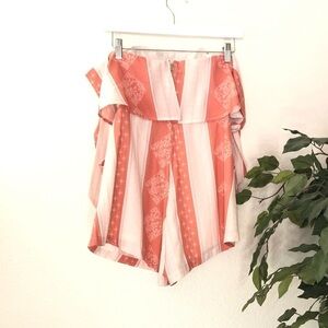A gorgeous strapless romper with wire in the front for a flatter fit. Elastic on the top to keep it up. Adorable ties for each arm. A peachish-pink color. Lined so it’s not see through.