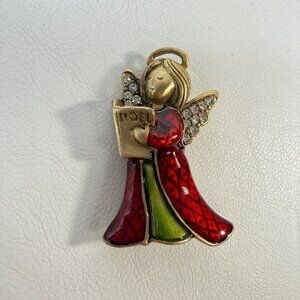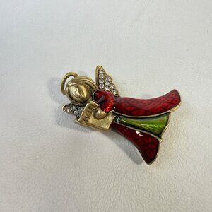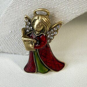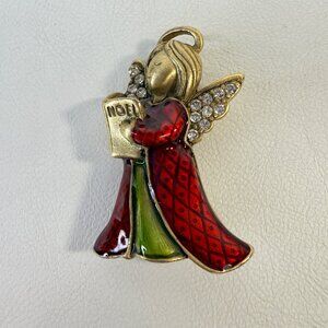 Festive brooch showcasing an angel holding a NOEL book. Features red and green enamel accents, rhinestone wings, and gold-tone metal for holiday charm.