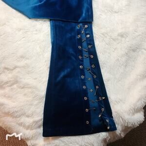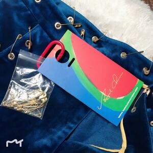 Designer brand jeans featuring velvet material, fanfare design and pin details.