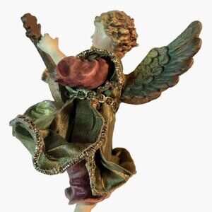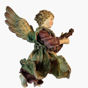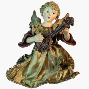 Angel Cherub Figurine Harp In Green Gold Brocade Dress Craft Flora Accent
