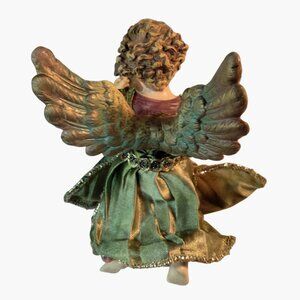 This delicate porcelain angel figurine is crafted with intricate detailing, featuring a serene expression and a flowing green and gold dress.