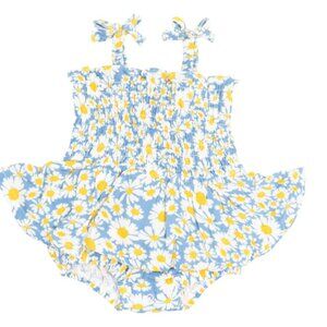 Charming floral bubble romper with a smocked bodice. Features blue and yellow daisy patterns.