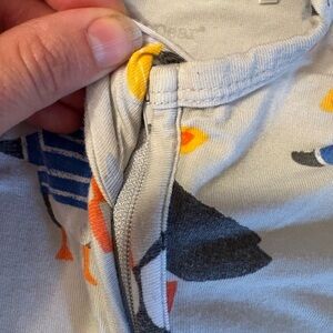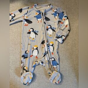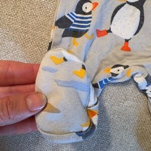 Angel Dear. Size newborn. Puffins print. Bamboo Viscose. 2-way Zipper. Footie. Pull over hand mittens. Preloved- like all Bamboo does show some fading and wash wear. No major flaws or stains. Cute print!