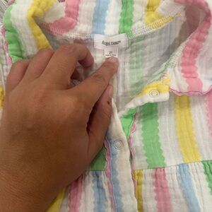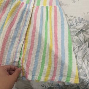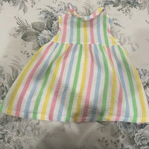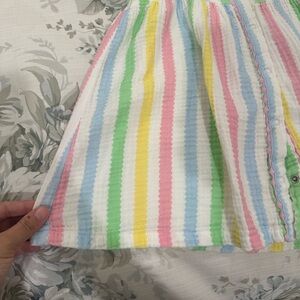 This sweet rainbow seersucker dress is full of playful charm. Featuring a classic Peter Pan collar, soft ric rac trim, and a button-up front for easy changes, it’s the perfect lightweight style for sunny adventures. Made from breathable cotton, it’s designed for comfort and cuteness all summer long.