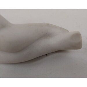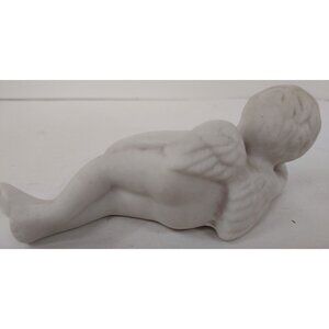 This unbranded Angel Figurine, laying on its side, is made from ceramic bisque. The white color adds a unique touch to this beautiful piece. The toe has a chip.