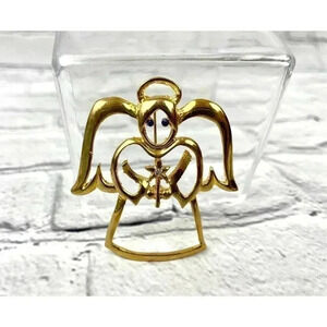 Angel Gold Tone Pin Brooch Christmas Holiday Blue Rhinestone Eyes