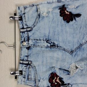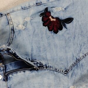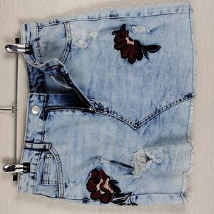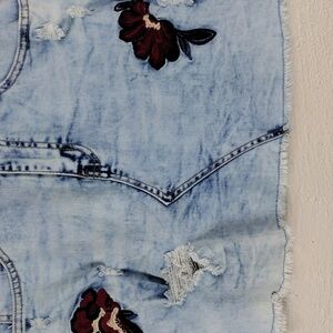 Angel Kiss Los Angeles Women's Blue Light Stone Wash Burgundy Floral Embroidered Five Pocket Button Zipper Front Closure Distressed Raw Hem Mini Jean Skirt. 70% Cotton, 28% Rayon, 2% Spandex. Measurements approx. Flat Lay. Waist: 14, Hips: 16, Length: 14.5". Size M Color May Vary Due To Lighting. NWT