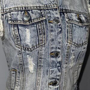 • Style: Distressed denim vest, sleeveless with frayed edges, button front, chest pockets