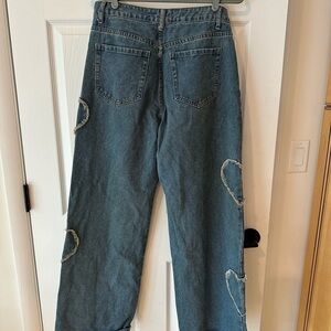Chic wide leg jeans with heart accents. Perfect for casual outings. Y2K distressed low rise jeans